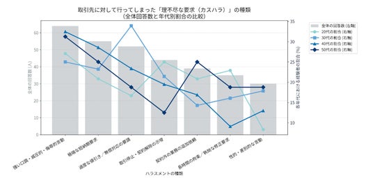年代別に見ると、特に30代で、「過度な値引き/無償対応の要請」、40代では「極端な短納期要求」が他の年代と比べてその割合が突出しています。