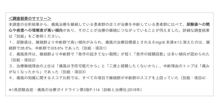 株式会社富士薬品(本社:埼玉県さいたま市代表取締役社長高柳昌幸、以下「富士薬品」)は、痛風に悩む患者さんの再発予防・重症化予防を目的にさまざまな企画を展開する、『痛風ZEROPROJECT』を立ち上げ、プロジェクト企画の第一弾として、30代から70代の痛風経験者868人(治療継続群551人、治療中断群317人)を対象に「痛風経験者を対象とした意識調査」を実施しました。『痛風ZEROプロジェクト』では今回の調査結果を受けて、2022年4月をめどに、患者さんに向けて痛風に関する疾患情報の提供サービスを開始予定です。痛風・高尿酸血症の患者さんに正しい情報をお届けすることで、治療の継続をサポートしていきたいと考えています。