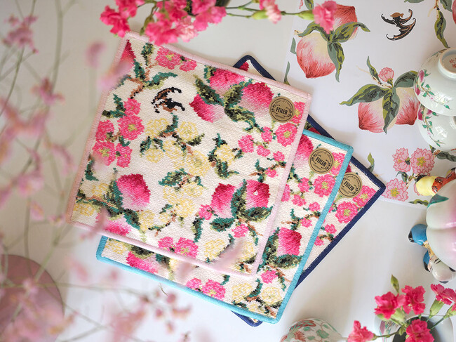 旬な季節の桃テキスタイルを使用した華やかなデザインは自身にはもちろんギフトにもぴったり。