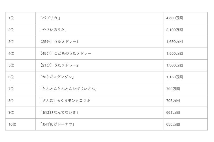また、童謡やキッズソングのうたがメドレー形式で収録されている「うたメドレー」動画も好評で、1,000万回再生を超える動画が3本もあります。視聴の多くはテレビで再生されており、ご家族そろってテレビ画面でYouTubeをみていただいていることがわかります。