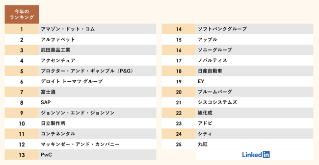 トップに立ったアマゾン・ドット・コム、2位のアルファベット、4位のアクセンチュアなど、以前からランキング上位に名を連ねるネット関連以外にも、プロクター・アンド・ギャンブル(P&G)やコンチネンタル、マッキンゼー・アンド・カンパニーなど、消費財や製造業、サービス業など幅広い業種の企業がランクインしています。
