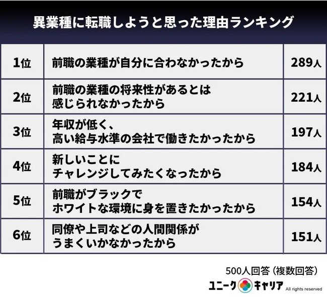 続く2位の「前職の業種の将来性があるとは感じられなかったから」と合わせ、業種に関する理由が上位にランクインした形だ。