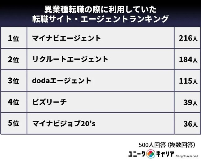異業種転職の際に利用していた転職サイト・エージェントランキング