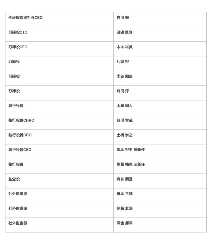 今後中長期的な成長を果たし、“選択”のインフラとしてサービスを強化していくため、複数企業で経営企画経験を持つ岸本裕史、社内で全事業部を経験し組織の中核を担う佐藤柚果を執行役員に選任することで、より一層経営体制を強化します。
