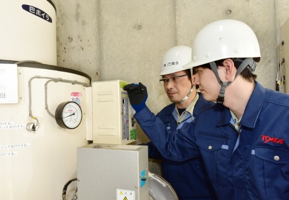 巴商会にはボイラ事業本部とコンテック事業本部があり、ボイラ事業部では製品開発からメンテナンスまでを一気通貫で行っています。北海道から九州まで13の営業拠点と松戸に工場があります。一般ボイラや温水機、ランドリー製品などを温浴施設や介護施設、工場や自治体などに納品しメンテナンスを行っています。もともと五右衛門風呂のように直接水を沸かすのが主流であった日本に、お湯を沸かす槽(釜)とお湯に入る槽(湯舟)を分ける循環釜方式を普及させた創業112年の歴史ある会社です。