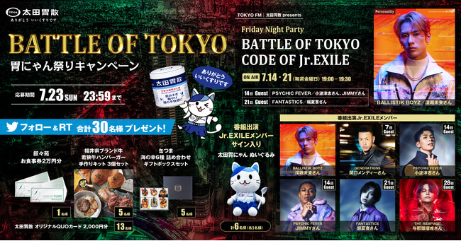 本キャンペーンは同社が提供しているTOKYO FM1ヶ月間限定プログラム『太田胃散 presents Friday Night Party BATTLE OF TOKYO CODE OF Jr.EXILE』(7月パーソナリティ:BALLISTIK BOYZ 深堀未来さん 毎週金曜日19:00~OA)とのコラボ企画となっておりますので、ぜひ番組もお聴きください。