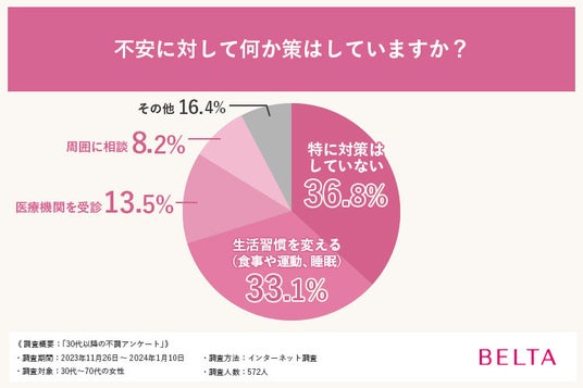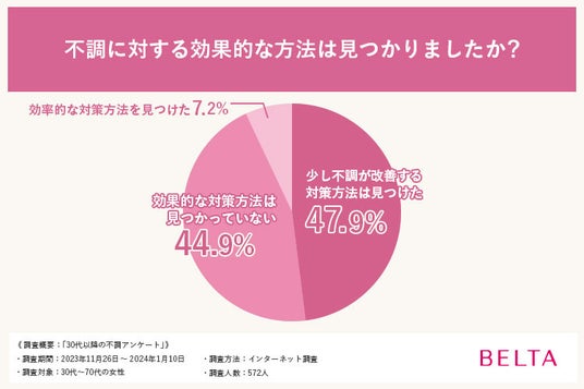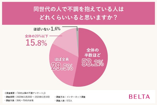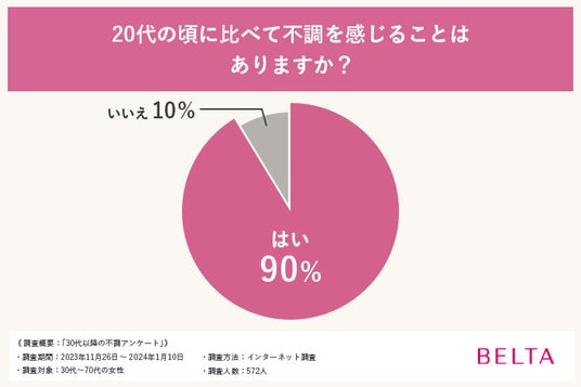 株式会社ベルタ(本社:東京都港区/以下ベルタ)が運営する女性ライフステージブランドBELTAは、30代~70代の女性572名を対象に「不調」に関するアンケート調査を実施いたしました。本アンケート調査を通して「30代以降女性たちの不調に対する捉え方や対策」についての実態が明らかになりました。
