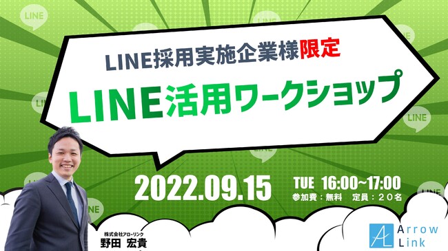 株式会社アローリンク(本社:兵庫県神戸市、代表取締役:蓬莱和真)は、9/15(木)にLINE採用実施企業様限定のLINE活用ワークショップを無料で開催します。今の学生に合わせた"LINE活用方法"について詳しくお伝えします。