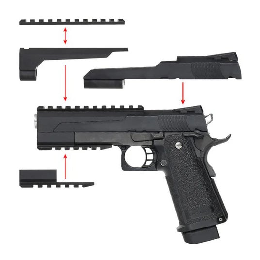 機能的なモジュール設計で、さらなる拡張性スライドとフロントブロックの独立した構造により、フロントブロックはアルミ合金製で重心を調整。これにより、連射時のブレを最小限に抑え、素早く狙いを定めやすくなります。さらに、ピカティニーレイルの搭載により、光学機器などを自由に装備可能です。