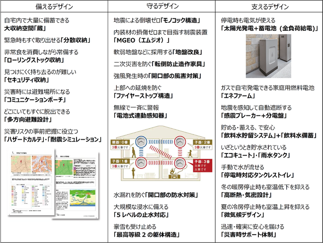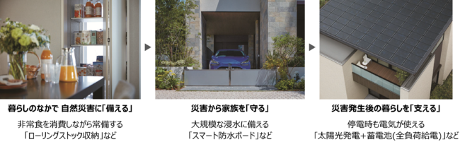 ミサワホームでは自然災害の頻発・激甚化を背景に、個別に対応していた地震や浸水、風災、雪害、火災への対策を2015年に体系化し、防災・減災デザイン「MISAWA-LCP」として提案を開始。いつもの快適に加え、もしもの安心について、「備える」・「守る」・「支える」の3つのフェーズに分類した建物と外構のソリューションを提案しています。