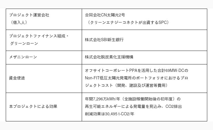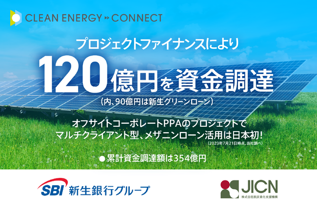 脱炭素経営企業、RE100参加企業等のお客様に対してNon-FIT太陽光発電によるグリーン電力と環境価値をお届けする株式会社クリーンエナジーコネクト(代表取締役:内田鉄平、以下「クリーンエナジーコネクト」)は、オフサイトコーポレートPPAのプロジェクトにおける約700箇所、計69MW-DCのNon-FIT低圧太陽光発電所の開発のため、株式会社SBI新生銀行および株式会社脱炭素化支援機構から、プロジェクトファイナンスにより総額120億円の資金調達を実施したことをお知らせいたします。