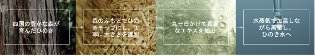 ひのきの幹や枝をチップ化したものから抽出したエッセンスを凝縮し、さらに濾過、蒸留することで得られる貴重なエキス「ひのき水*」の性質が、理想とする美しくすこやかな肌を育むために欠かせない3つの条件と合致することを見出しました。
