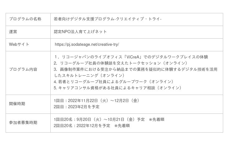 株式会社リコー(社長執行役員:山下 良則)、リコージャパン株式会社(社長執行役員:木村 和広)、認定NPO法人育て上げネット(理事長:工藤 啓、以下 育て上げネット)は協働で、急速なデジタル社会の進展のなかで、情報格差により就労に困難を抱える若者たちの支援を行う「若者向けデジタル支援プログラム」を昨年度に引き続き本年度も実施し、本日より募集開始します。
