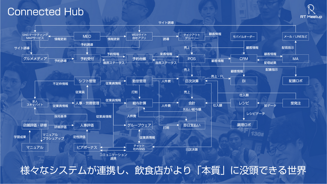 またConnected Hub"という取り組みも行っています。これは、人と人のつながりだけでなく、システム間のつながりを活性化するためのプロジェクトで、国内標準のAPIリファレンスの制定に取り組んでいます。これにより、飲食店がレストランテックツールを採用した際のデータ連携の問題を解決し、結果的に人の作業を減らすことを目指しています。