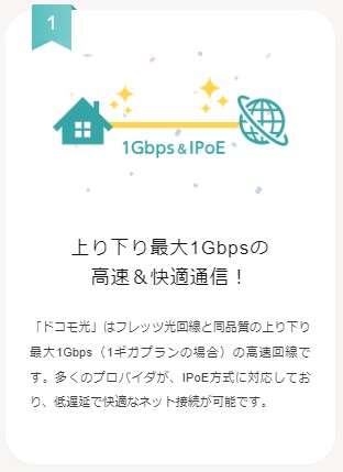 「ドコモ光(1ギガ)」の最大通信速度はフレッツ光回線と同品質の最大1Gbpsと快適な通信環境でご利用頂けます。※最大速度はベストエフォート型となっております。