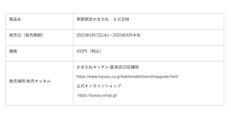 とよす株式会社(本社:大阪府池田市 社長:眞田 昌彦)は、百貨店を中心に展開しているブランド「かきたねキッチン」において、『季節限定かきたね えだ豆味』を2023年6月7日(水)から期間限定で発売いたします。