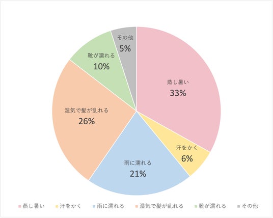 Q1で「はい」と回答した302名に、続けて「Q2.どんな時に最もストレスを感じますか?」と質問をした。結果は「蒸し暑い」が33%、「湿気で髪が乱れる」が26%、「雨に濡れる」が21%となった。
