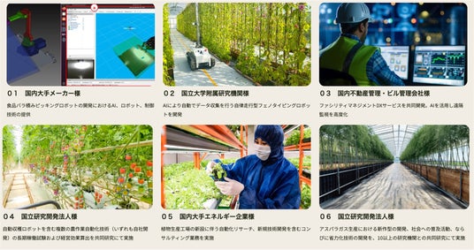 食品業界向け食品バラ積みピッキングロボットの開発、国立大学研究機関と連携した自律走行型フェノタイピングロボット開発、不動産業界向け遠隔監視を高度化するファシリティマネジメントDXサービス開発、農業用ロボットを活用した農作業自動化の長期稼働試験と経営効果算出、植物生産工場の自動化に関する新規技術開発およびコンサルティング業務など幅広い業界で多数のAI・ロボティクス開発実績があります。