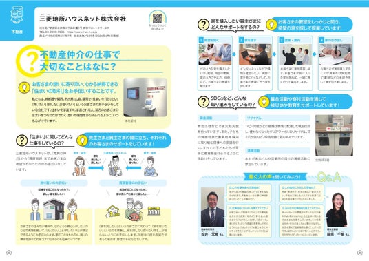 住まいをはじめ人々の暮らしを支える三菱地所グループでは、不動産事業と教育事業は親和性が高い領域と捉えており、教育に対する社会課題解決や新たな価値創造に積極的に取り組んでまいりました。令和2年に全面施行となった文部科学省が定める学習指導要領では、小学校・中学校ともに総則に「キャリア教育の充実」が盛り込まれています。しかし、教育現場からは「キャリア教育の適正な教材が得られない」等の声が挙がっており、三菱地所ハウスネットはこのような教育課題の解決に寄与すべく、この度の協賛に至りました。地域の小学生・中学生に向け、働くことへの関心を深め身近な仕事への気づきを得る機会を提供し、将来の進路選択のきっかけづくりを支援することで、キャリア教育の充実、価値向上に貢献いたします。誌面では、当社の業務概要や様々な取り組み、不動産取引に関する具体的な仕事内容、実際に働く社員の声などを掲載しています。
