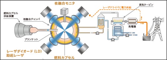 現在、最も研究が進んでいるレーザフュージョン研究は、重水素と三重水素を入れた燃料ターゲットに大出力のレーザを照射し原子核同士が融合する反応であり、この際に発生する莫大なエネルギーを利用した発電への期待が高まっています。