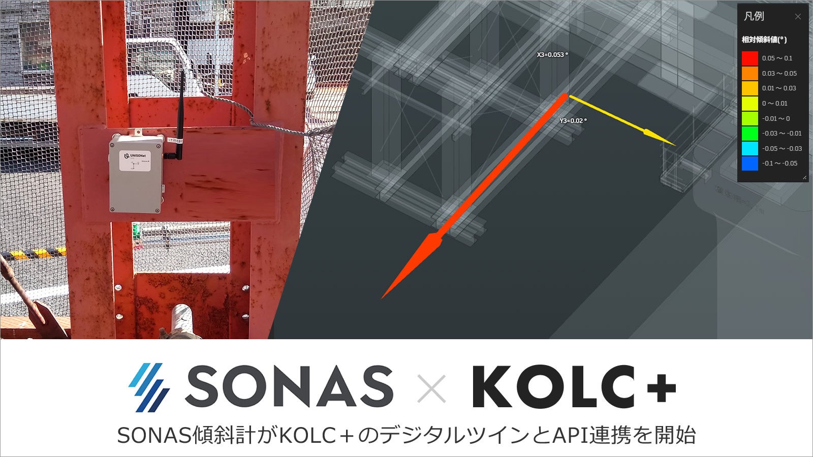 ソナス株式会社(東京都文京区:代表取締役CEO 大原壮太郎、以下「ソナス」)、株式会社コルク(東京都豊島区:代表取締役 堤 正雄、以下「コルク」)の2社は、ソナスが提供する「無線式 傾斜監視システム」で取得した計測データを、コルクが提供するBIM/CIMクラウド「KOLC+」にAPI連携し、デジタルツイン上に傾斜量と傾斜方向を3Dグラフとしてダッシュボード表示可能になったことをお知らせいたします。