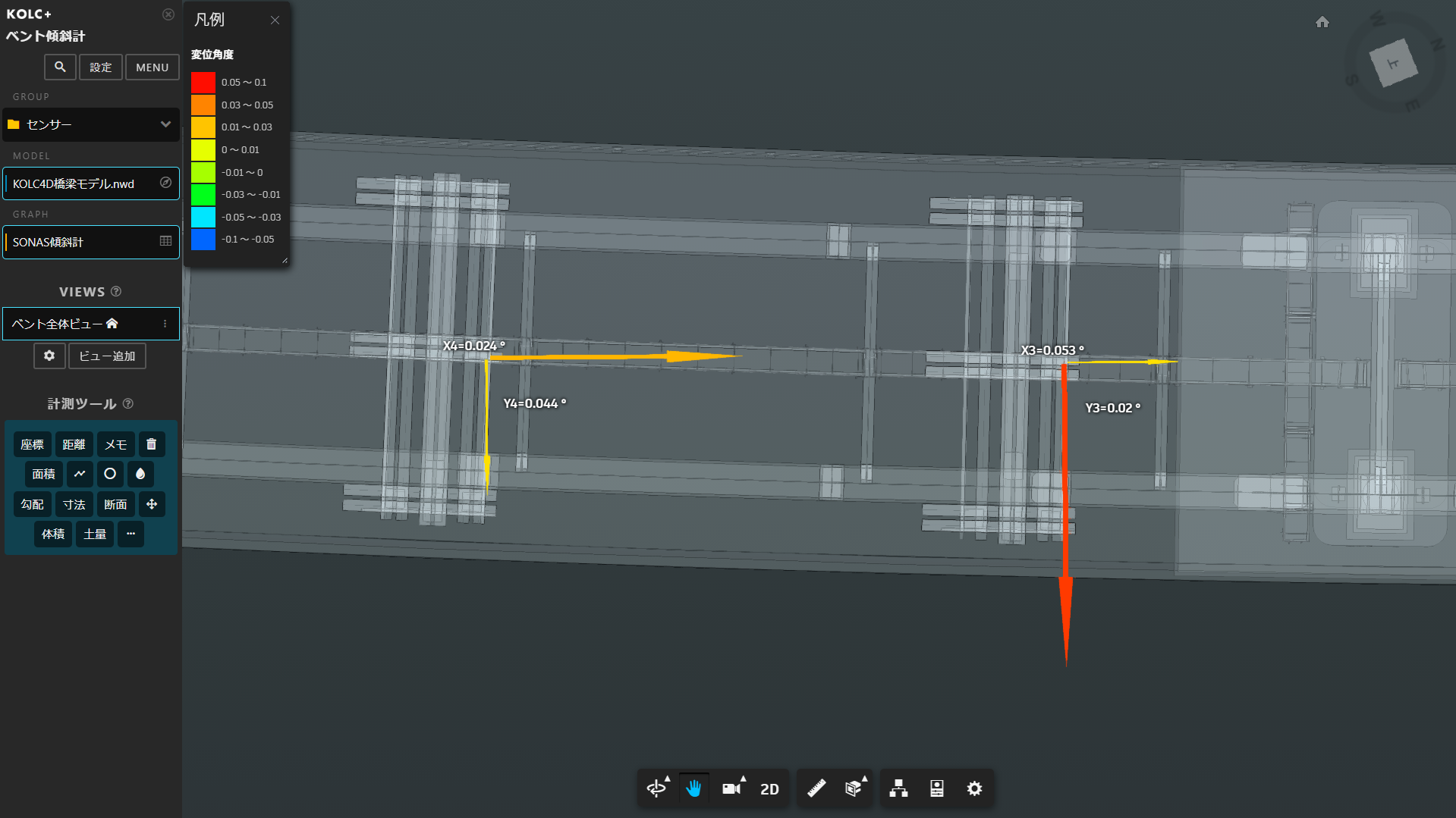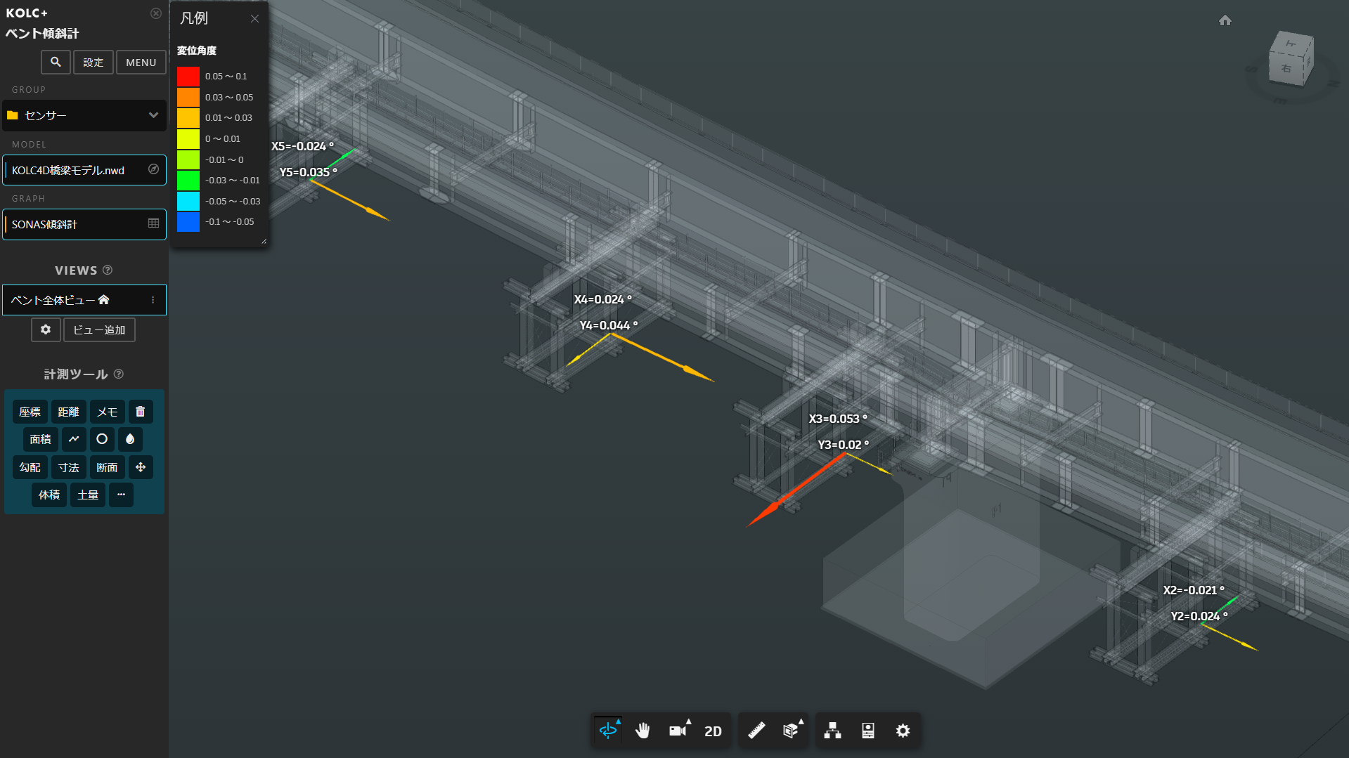 KOLC+のBIM/CIMモデル上にSONAS傾斜計を連携した例。傾斜計の設置方向に合わせてX・Y軸を定義し、傾斜量と変位方向を矢印グラフで表現しています。