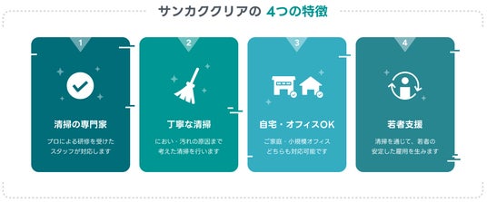 「サンカククリア」はプロのもとで技術を習得した若者が、専用洗剤・機材を用いて丁寧に仕上げる清掃サービスです。若者支援を目的とした事業ではありますが、清掃事業を専門とするアカンパニー合同会社の皆様にご協力いただき、品質を第一に運営しております。