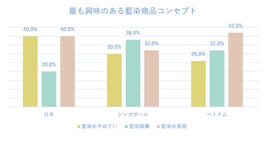 - 最も興味がある藍染商品コンセプトについて、「手ぬぐい」「暖簾」「食器」の3つの商品コンセプトを提示したところ、国によって最も関心が高い商品が全て異なる結果に。日本においては「手ぬぐい」と「食器」が同等40.0%で最も高く、「暖簾」20.0%とは大きな差があった。シンガポールでは、「暖簾」が最も高く38.0%だが、「手ぬぐい」「食器」も30%台で、どの商品でも大きな差はなく好みが分散。一方ベトナムは、「食器」が最も高く42.0%、次いで「暖簾」32.0%、「手ぬぐい」26.0%と続く。