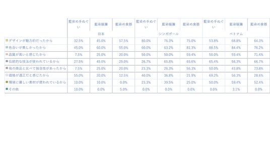 - - 「手ぬぐい」では、日本「価格が適正だと感じたから」、シンガポール「デザインが魅力的だったから」、ベトナム「色合いが美しかったから」がそれぞれ最も多い理由であった。「価格が適正だと感じたから」は、ベトナムにおいても2番目に多い理由となり、手に入れやすいリーズナブルな価格提示は、藍染商品に興味をもつきっかけとしても一つの魅力といえそう。