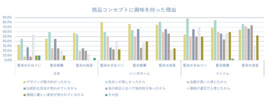 - - 食器では、日本「デザインが魅力的だったから」、シンガポールとベトナム「色合いが美しかったから」、がそれぞれ最も多い理由であった。特にベトナムでは「他の商品と比べて独自性があったから」「品質が高いから」もそれぞれ70%を超える結果で、コンセプト説明にもある木製食器に藍染めを施す独自技術や美しい色合いとデザイン性が高く評価されているようだ。