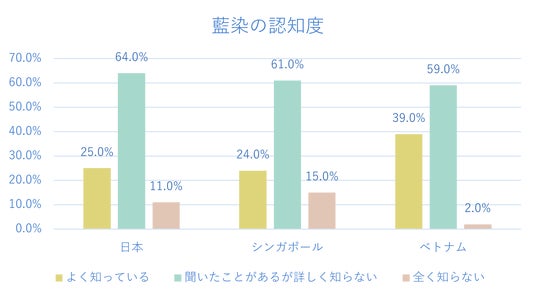 藍染の認知度は、伝統工芸品に関心のある人であっても「聞いたことがあるが詳しく知らない」が半数以上と、最も多い回答になりました。「よく知っている」と回答したのはベトナムが最も多く39.0%で、その他の国では20%台にとどまっています。