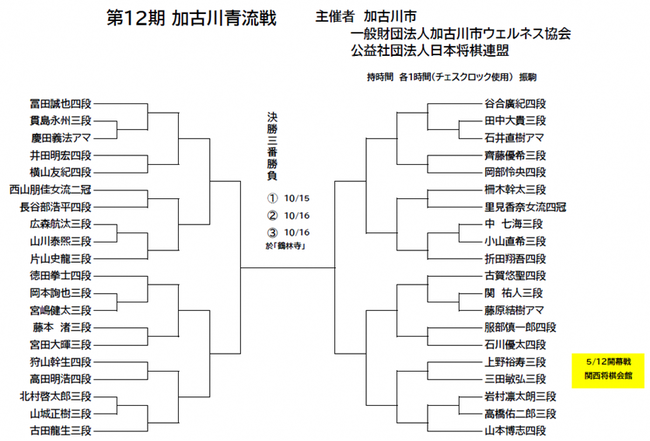 「第12期加古川青流戦」のご取材については、公益社団法人日本将棋連盟の規定がございます。