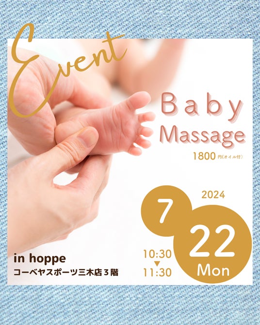 特定非営利活動法人ほっぺ(代表:大森 奈津子)は親子向けイベントとして、2024年7月22日(月)にhoppe(コーベヤスポーツ三木店3階)にて、ベビーマッサージ体験ができる「Baby Massage in hoppe」を開催いたします。