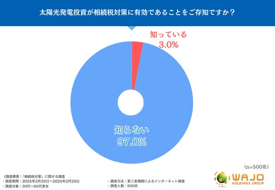 次に、『太陽光発電投資が相続税対策に有効であることをご存知ですか?』と質問したところ、「知っている(3.0%)」「知らない(97.0%)」と、知っていると回答した方はわずかでした。