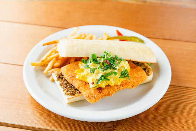フライドフィッシュサンドイッチ カレータルタルソース 国産小麦を使用したオリーブオイル入りのソフトなパンに、ザクザクのフライドフィッシュとカレータルタルソースが絡み合い、食欲が刺激されるサンドウィッチ。