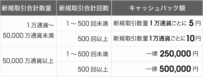 ・10万通貨単位で、100回新規取引(計1,000万通貨) ⇒ 5,000円キャッシュバック