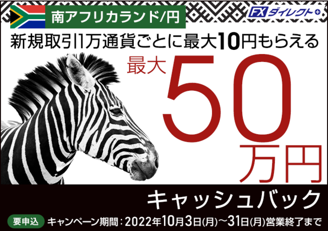 セントラル短資FX株式会社(本社:東京都中央区、代表取締役社長:松田 邦夫)は、2022年10月31日まで南アフリカランド/円の新規取引を対象としたキャッシュバックキャンペーンを実施します。