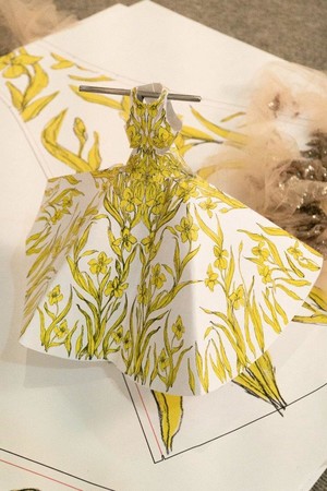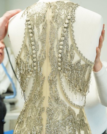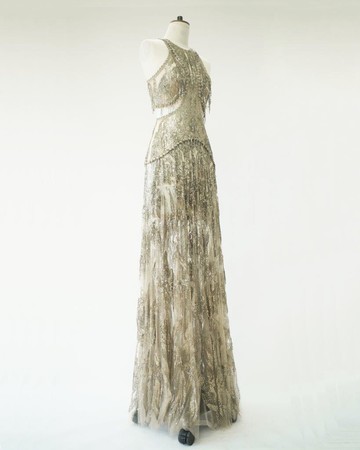 シルクチュールにシルバーメタルスパンコールで描かれたアイリスの刺繍や、繊細なカットワークが特徴的なオーダーメイドドレスに、アンティークシルバーのヘアクリップ、アンクルストラップのサンダルを合わせて着用しました。