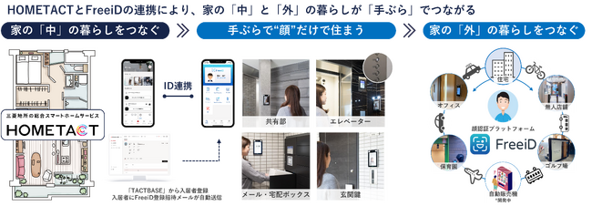 住宅設備機器・生活家電などのIoT機器を、スマホアプリやスマートスピーカーなどと連携させ、家の「中」の暮らしを便利で快適にするHOMETACTと、手ぶらで“顔”だけで住まうことができ、1度登録した顔で様々な顔認証サービスを利用可能にする、玄関から家の「外」の暮らしをつなぐFreeiDが連携することで、家の「中」と「外」の暮らしが「手ぶら」でつながる世界を実現します。