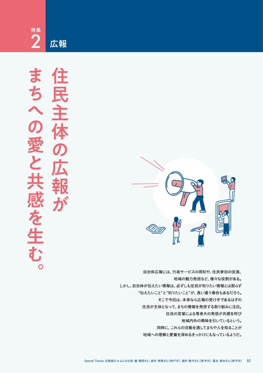 自治体広報には、行政サービスの周知や、住民参加の促進、地域の魅力発信など、様々な役割があります。しかし、自治体が伝えたい情報は、必ずしも住民が知りたい情報とは限らず、“伝えたいこと”と“知りたいこと”が、食い違う場合もあるでしょう。そこで今回は、本来なら広報の受け手であるはずの住民が主体となって、まちの情報を発信する取り組みに注目。住民の言葉による等身大の発信が共感を呼び、地域内外の興味を引いているといいます。同時に、これらの活動を通してまちや人を知ることが、地域への理解と愛着を深めるきっかけにもなっているようです。