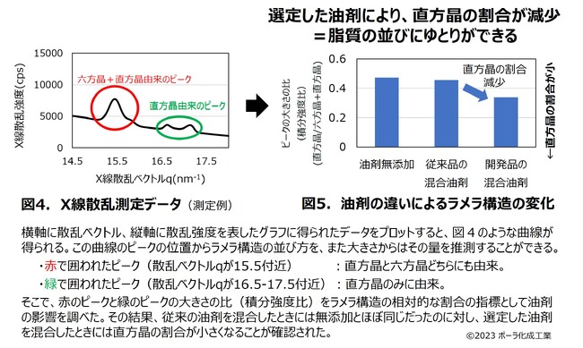 直方晶の割合が少なくなったことから、配合した油剤により、ラメラ構造を作る脂質同士の並びにゆとりができたことが示唆されます。