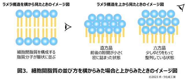 細胞間脂質のラメラ構造には、脂質の並び方が異なる「直方晶」と「六方晶」があります(図3)。直方晶は、前後の脂質分子との距離が近く、ぎゅっと密に詰まって並んでいる状態です。一方、六方晶は、前後の脂質同士の距離が少し遠く、ゆとりをもって並んでいる状態です。この他、脂質分子が乱れた「液体状態」もあります。