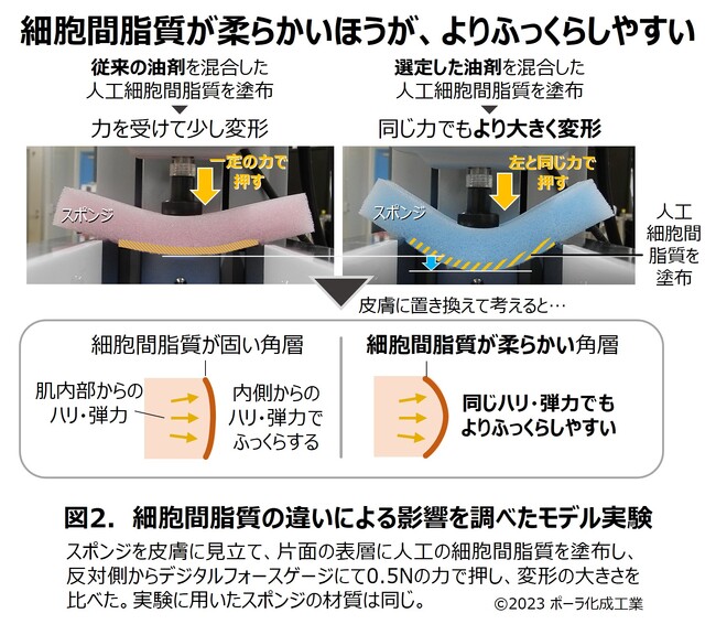 本研究で見出した油剤で柔軟化させた人工の細胞間脂質をスポンジに塗布し反対側から押すと、スポンジの変形が大きくなりました。このことから、角層でも細胞間脂質を柔軟にすると、よりふっくらしやすくなることが期待できます。
