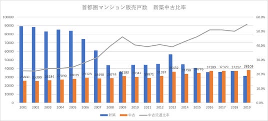 (図2 首都圏のマンション流通量) 【出典】新築マンション販売戸数(株)不動産経済研究所 マンション市場動向 中古マンション成約件数 公益財団法人 東日本不動産流通機構 月例マーケットウォッチ