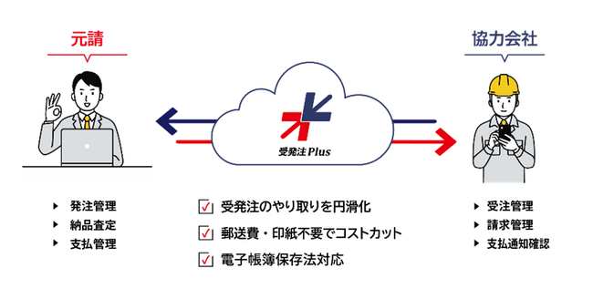 「受発注Plus」は、住宅会社の受発注業務を電子化する住宅建設業向けクラウドサービスです。公益社団法人日本文書情報マネジメント協会(JIIMA)が認証する「電子取引ソフト法的要件認証」を取得した「注文分譲クラウドDX」の電子受発注の仕組みをそのままに、誰でも簡単に利用できるシンプルなUIと直感的な操作性を実現しました。タイムスタンプを必要としない方法で「改正電子帳簿保存法(電子取引)」に対応しているので、コストを気にすることなく、手軽に電子受発注をスタートできます。受発注業務の電子化により、業者への発注から納品・査定・支払まで、一連の業務を効率化でき、発注忘れ、請求忘れ、支払漏れなどの手戻りも防止できます。さらに、郵送代や印紙代、紙代などが不要となり、コスト削減にも大きく貢献します。「受発注Plus」は住宅会社のDXを推進し、競争力強化をサポートします。