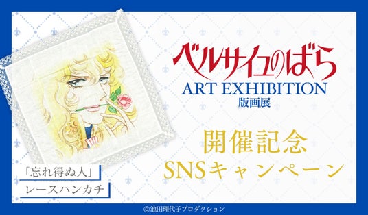 展示会開催を記念して、X(旧Twitter)とInstagramで、ベルサイユのばらのレースハンカチ「忘れ得ぬ人」を合計4名様にプレゼント致します。