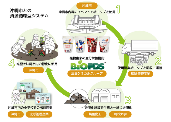 使用済みの紙コップは、琉球管理産業株式会社が回収・運搬し、共和化工株式会社と琉球大学が、同大学内の堆肥化施設で牛糞と一緒に堆肥化を行います。堆肥は沖縄市内の緑化活動などに用いる計画で、本取り組みを通して沖縄市における資源循環型システムの実証を行います。さらに、沖縄市、琉球管理産業が中心となり、沖縄市内の小学校での出前授業なども行う予定です。