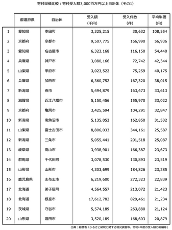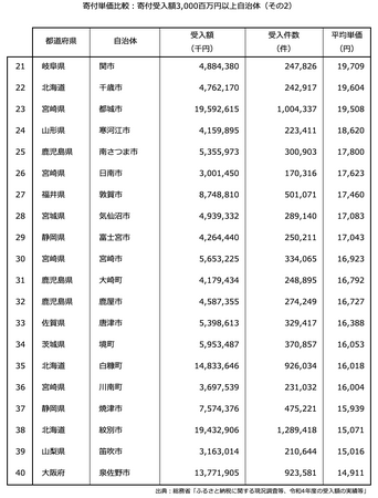 寄付額10億円から30億円、寄付額10億円以下の自治体グループ1位から40位データにつきましては、ふるさと納税総合研究所のホームページにて公開いたします。(要メルマガ会員登録)