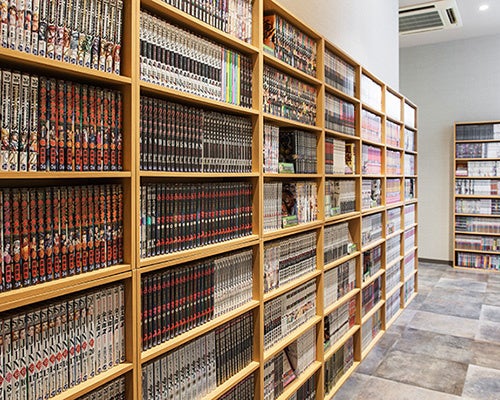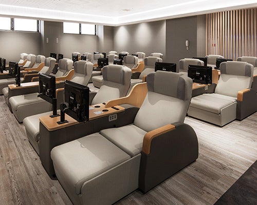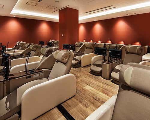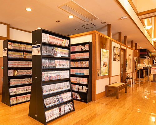 入浴後にくつろげる空間も充実しています。男女共用・女性専用のリラックスラウンジは、TV付リクライニングチェアでゆったりくつろいでいただけます。シートには電源コンセントを設置しているので、スマホなどの充電ができます。全席指定のプレミアムラウンジ(有料)ではご滞在中シートの確保を気にすることなくご利用いただけます。館内には10,000冊以上の漫画がそろっている読書コーナーがあり、漫画はリラックスラウンジや岩盤浴に持ち込むことができます。また、館内はフリーWi-Fi完備なので、電源コンセント設置のフリーラウンジでPC作業も可能です。