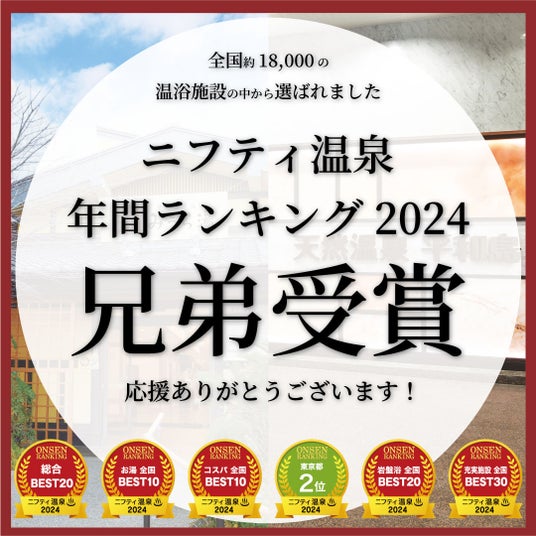昨年2023年度の「全国総合ランキング」では、天然温泉平和島は21位、黒湯天然温泉みうら湯は33位でしたが、今年度のランキングでは両店とも大きく順位が上がりました。この受賞を記念して、両店ではニフティ温泉のサイトにてお得にご利用いただける割引クーポンを配布いたします。